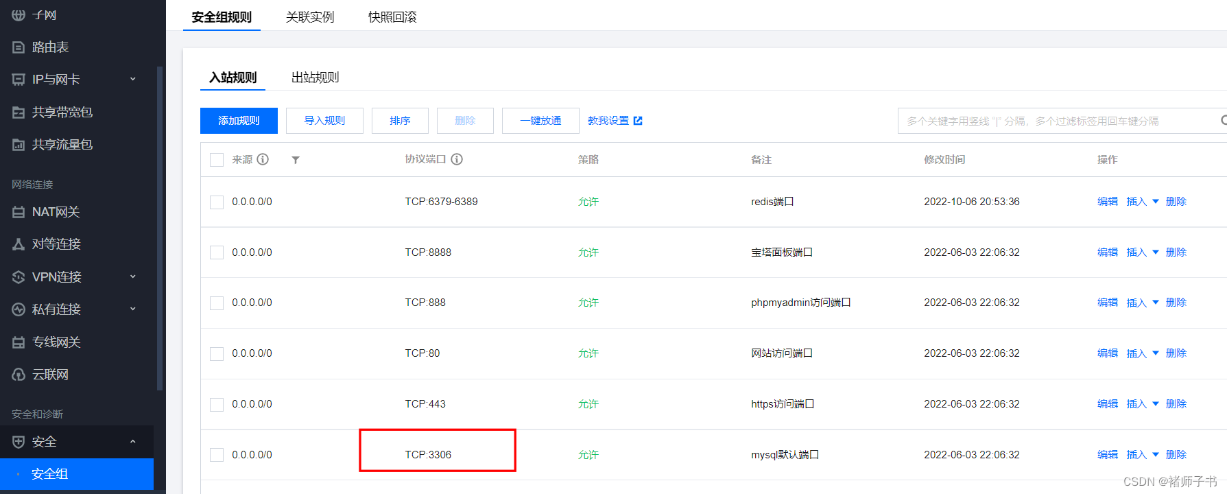 - **云服务器:**配置安全组入站访问规则,增加3306端口号。