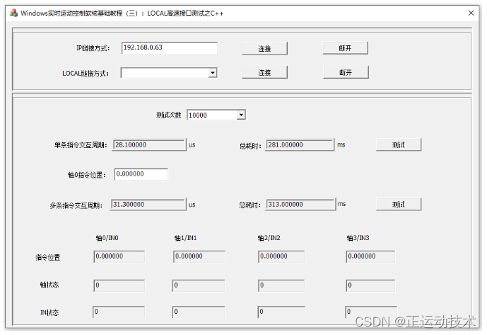 以上分别是对IP方式链接MotionRT7与LOCAL方式链接MotionRT7的指令交互测试,从上面运行效果图的数据显示来看,当进行1w次和进行10w次的单指令交互或多指令交互的时候,LOCAL链接的方式进行指令交互所需要的单条指令交互时间(平均4.7us左右和3.9us左右),一次性读取12个状态的多条指令交互时间(平均6.2us左右和5.5us左右)都比IP链接的方式更快(平均28us左右与29us左右)。