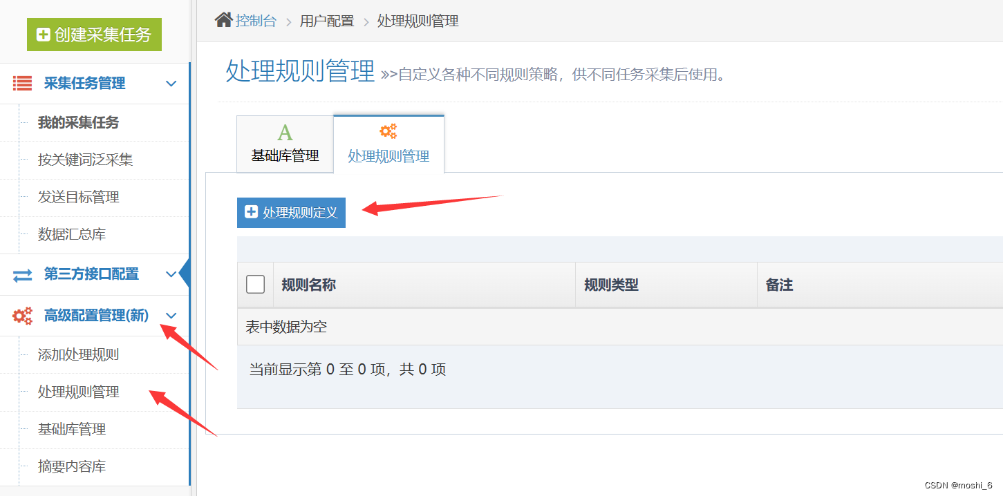 在简数采集器左侧导航菜单,点击展开【高级配置管理】 --》点击【处理规则管理】--》点击【处理规则定义】按钮,即可添加一个新的处理规则。