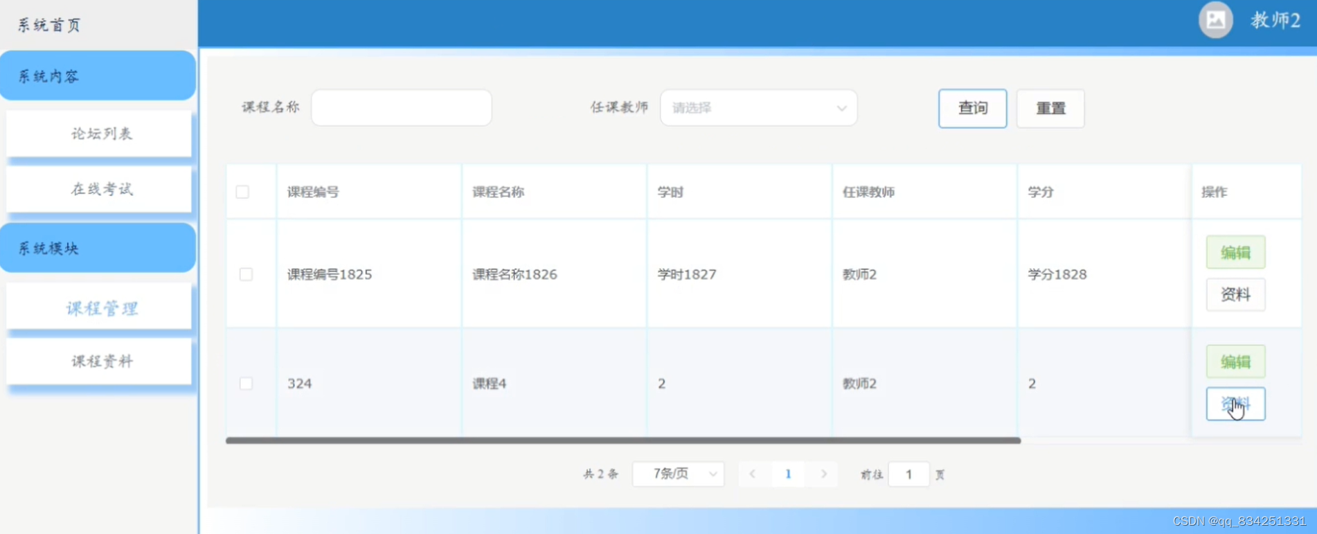 (2)系统模块:在“系统模块”这一菜单下,可以对教师操作的课程管理、课程资料等增删改查。