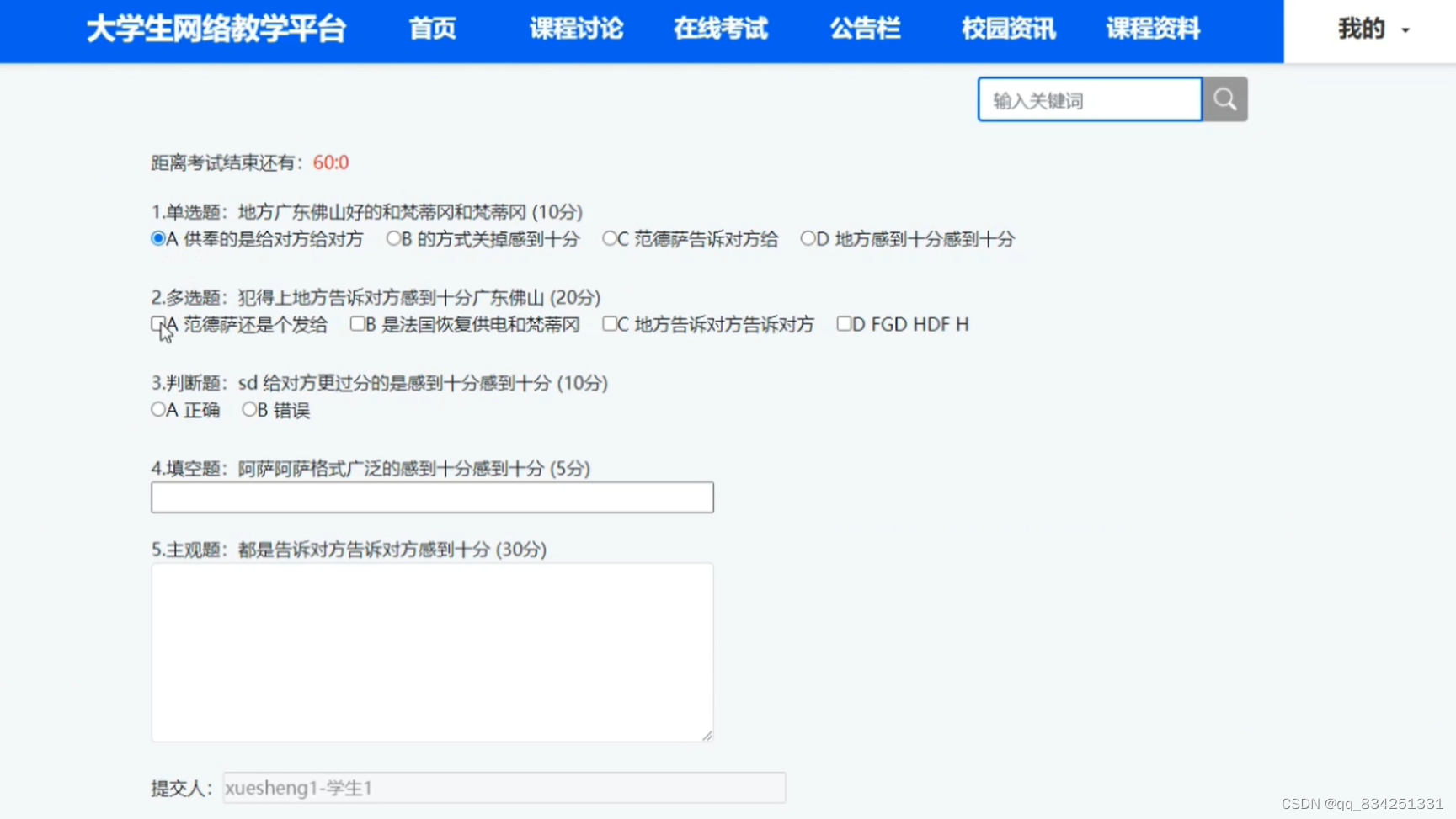 (2)查看大学生网络教学平台的首页信息:大学生网络教学平台的首页信息包含了首页、交流论坛、随堂测试、公告消息、校园资讯、作业发布等。