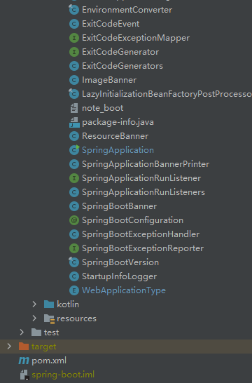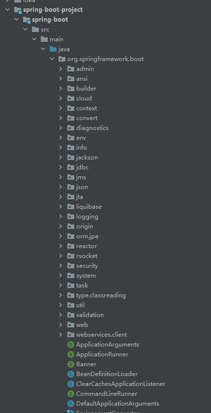 SpringBoot的全部功能在spring-boot-project模块实现,下面重点来介绍下 spring-boot-project 模块,其中spring-boot模块是Spring Boot核心代码,也是入口类SpringApplication类所在项目。如下图是spring boot模块的展开图