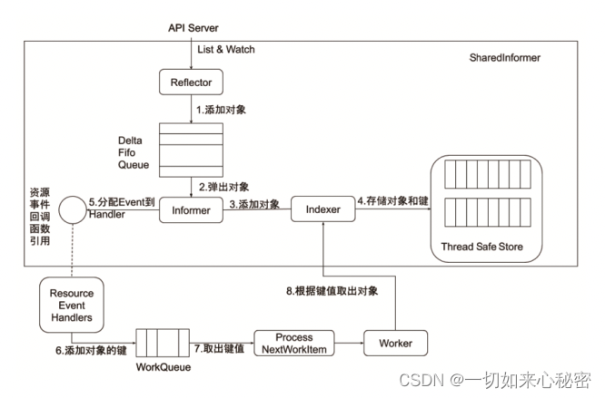 - 每个对象状态的变更,都会分配到一个Event 进行处理,当处理完毕后,会将处理过的状态也同步更新至 Thread Safe Store, 这里的 Thread Safe Store 就是Controller Interface 中的Lister 中缓存的对象状态。