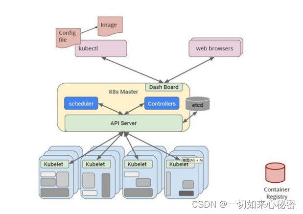 用户与K8s的交互以及k8s 间各组件间的交互都需要通过API Server, master 与 worker 节点都不能直接与etcd 交互,也只能通过API Server。