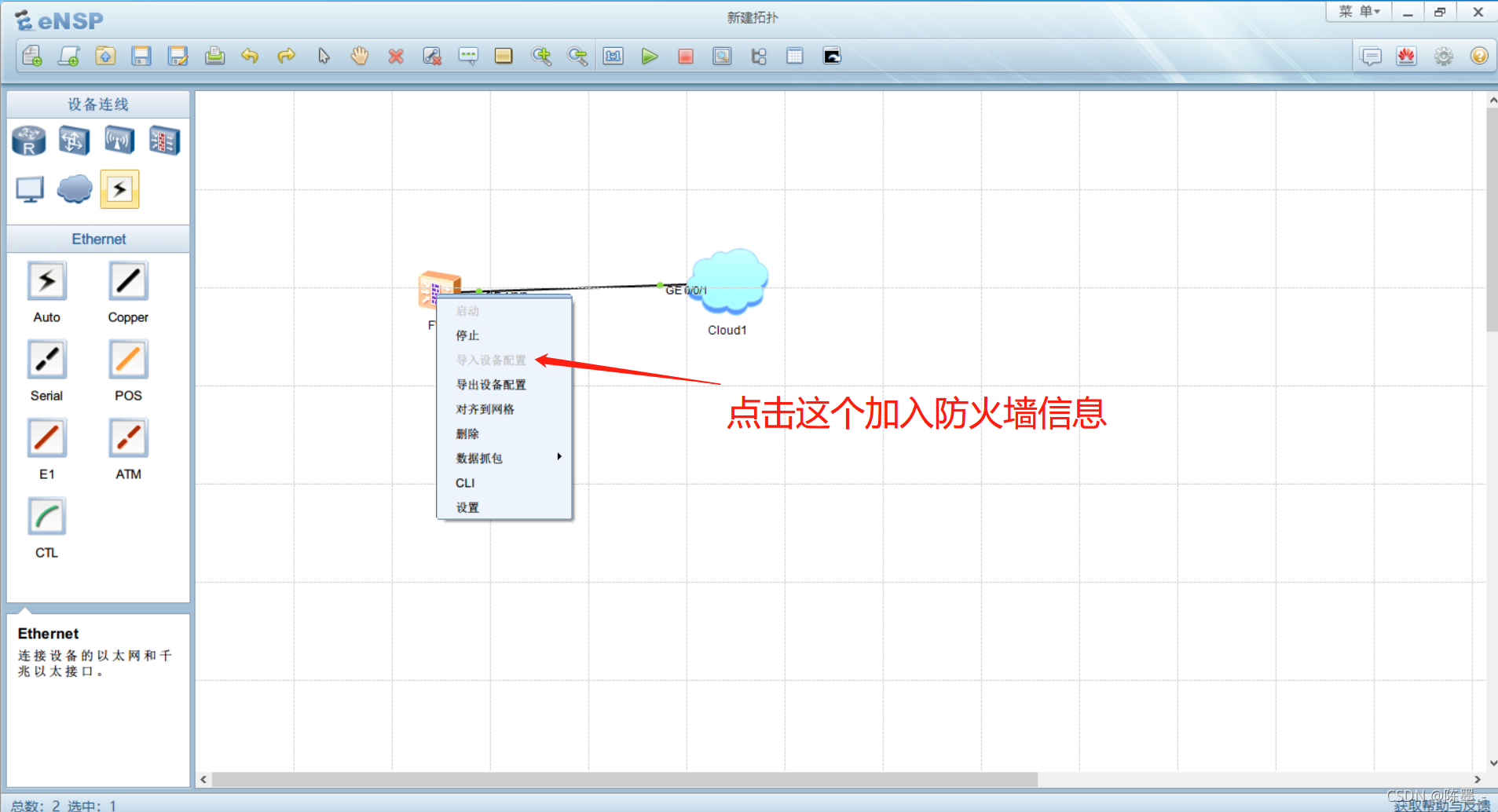 因为我们要在电脑浏览器上访问防火墙的管理界面,我们需要添加一个云,来使我们的电脑与eNSP可以建立连接。