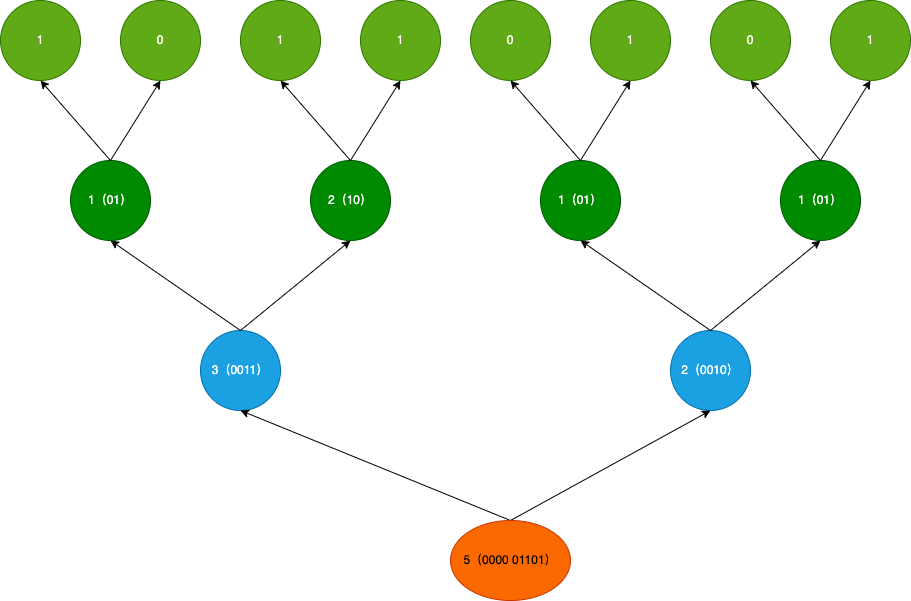 - 两两一组相加,将8位二进制会分为4组(如果是32位,那么就会分成16组)。相加后二进制表达为 01_10_01_01,代表的是4组结果:1 + 2 + 1 + 1 = 5。
