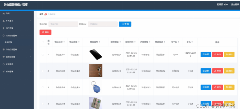 失物招领管理,在失物招领管理页面可以对索引、物品名称、物品数量、物品图片、拾得地址、拾得时间、认领地址、物品描述、用户名、手机等信息进行详情,修改或删除等操作,如图5-10所示。