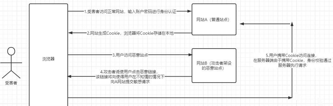 因为同源策略的限制,当正常用户通过账号密码等方式登陆网站A后,在不注销账号或当前Cookie失效之前,再次访问网站A时(协议、IP、端口号相同则属于同源)浏览器会自动在http请求包中带上该网站用户登陆后的Cookie信息。