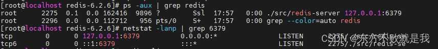 命令ps -aux|grep redis 查看redis进程,并查看6379端口号是否被监听。如图可以看到redis服务已开启,端口被监听。