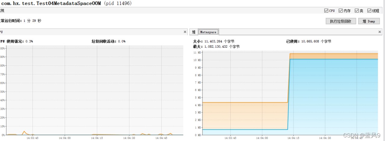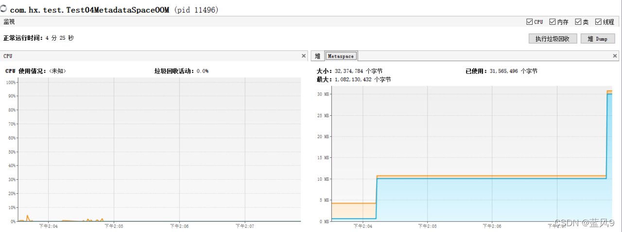 要检测 metadataspace 的使用, 可以通过 jvisualvm 来 inspect, 我这里写了一个 agent 来查询具体的信息, 这里我们两者放在一起 参照一下
