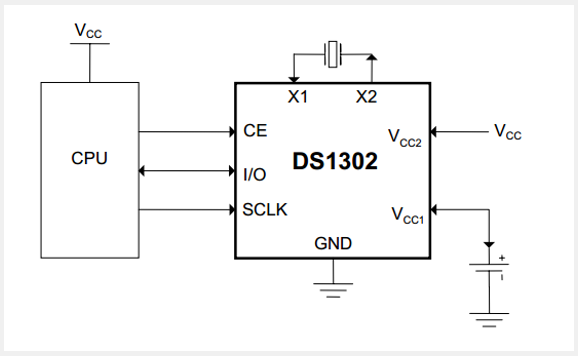 那么有了这个主电源和这个备用电源就可以保证了我们这个时钟芯片的这个电源是非常的充分了。在上电的时候Vcc2当做电源,一旦掉电就切换到备用电池,保证它还能够正常工作。