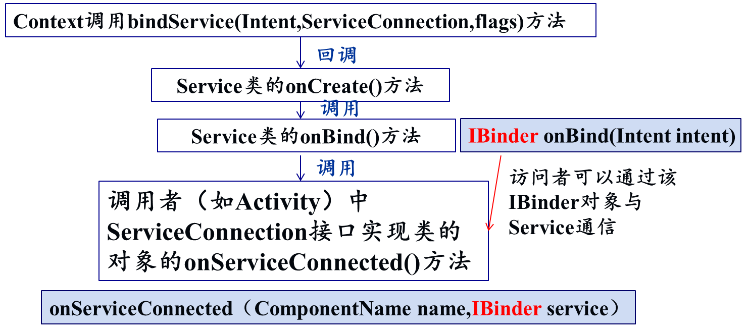 当首次使用bindService绑定一个Service时,系统会实例化一个Service实例,并调用其onCreate()和onBind()方法,然后调用者就可以通过IBinder和Service进行交互了,此后如果再次使用bindService绑定Service,系统不会创建新的Sevice实例,也不会再调用onBind()方法,只会直接把IBinder对象传递给其他后来增加的客户端!