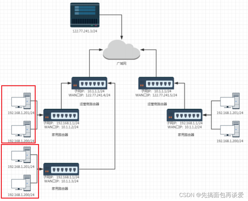 可以看到这个运营商路由器所构建的子网,其自身的LAN口IP就是10.1.1.1,然后上方的家庭路由器WAN口IP是10.1.1.2,下方家庭路由器的WAN口IP是10.1.1.3,这两个家庭路由器所连接的WAN口IP就是由运营商路由器所构建出来的子网。但是运营商的WAN口IP是122开头的,这个就是公网了,也就是说这个运营商路由器连接了公网,并且自身构建了一个私网。