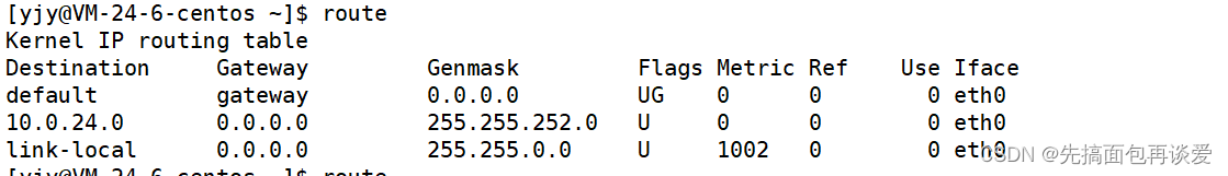 路由表的Destination是目的网络地址,Gateway是下一跳地址,Genmask是子网掩码,Iface是发送接口,Flags中的U标志表示此条目有效(可以禁用某些条目),G标志表示此条目的下一跳地址是某个路由器的地址,没有G标志的条目表示目的网络地址是与本机接口直接相连的网络,不必经路由器转发。