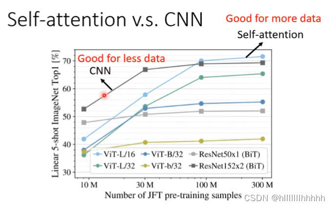 在训练资料多的时候,self-attention可以从大量资料获得信息,而cnn有所限制