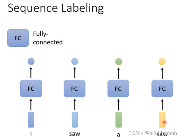 - 每一个向量输出一个标签:词性标注、语音识别、购物与否