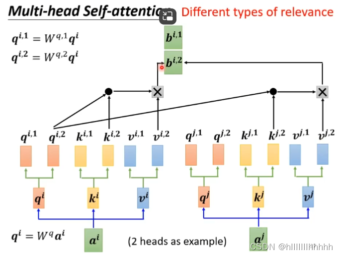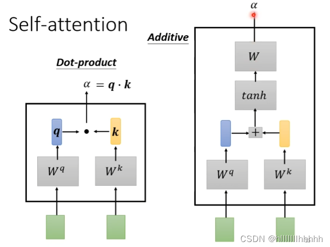 dot-product:向量*Wq 得到 q,q*k得到 α值