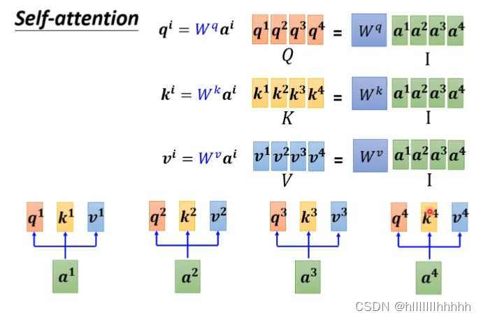 第二个图:补充了自己查询这一步,计算了k1=wk*a1,得到k1,k1 * q1 得到 α11