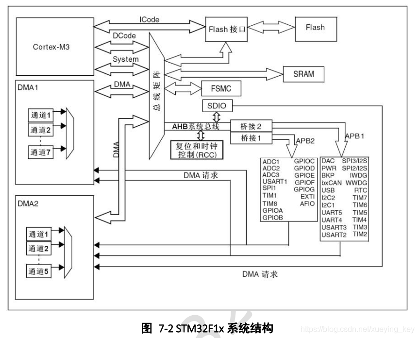 首先我们来看中蓝色虚线指示的电路流程。它是一个产生中断的线路,最终信号流入到 NVIC 控制器内。