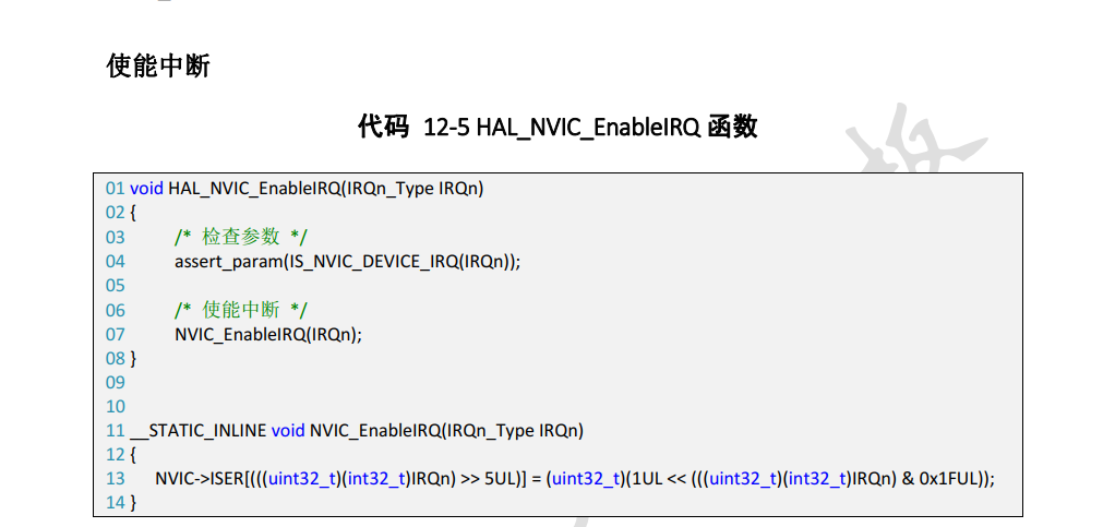 HAL_NVIC_EnableIRQ 函数用于在 NVIC 控制器中使能指定中断, 它有一个形参, 是 IRQn_Type 类型参数
