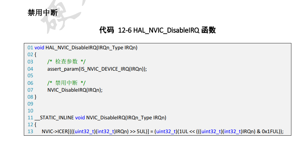 HAL_NVIC_DisableIRQ 函数是在 NVIC 控制器中禁用指定中断, 用法与HAL_NVIC_EnableIRQ 函数相同。 最终通过设置 NVIC_ICER 寄存器值实现功能。