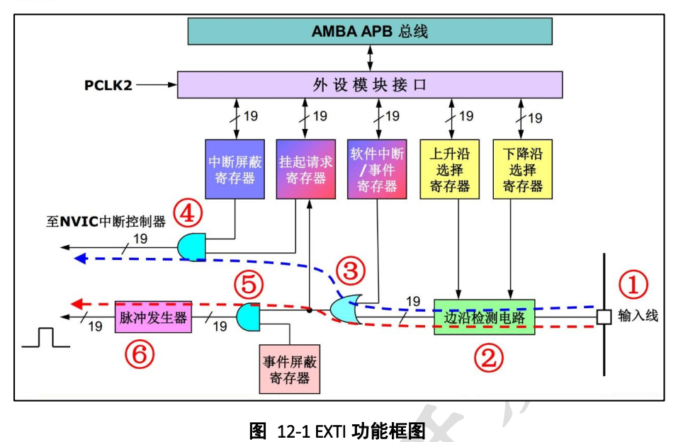 EXTI 可分为两大部分功能,一个是产生中断,另一个是产生事件,这两个功能从硬件上就有所不同。