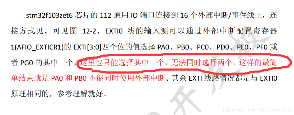 注意外部中断的每一条线同时只能选择一个,也就是说你选择PA0,那么就不要通知选择PB0,因为共用一条线;如下两张图所示: