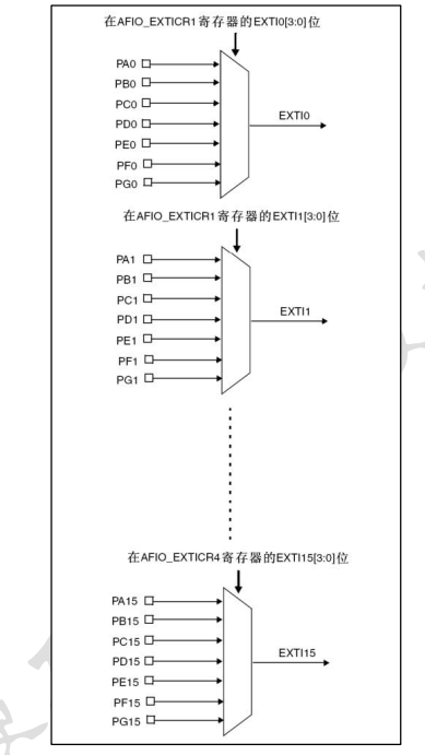 编号 1 是输入线, EXTI 控制器有 19 个中断/事件输入线,这些输入线可以通过寄存器设置为任意一个 GPIO,也可以是一些外设的事件。输入线一般是存在电平变化的信号。