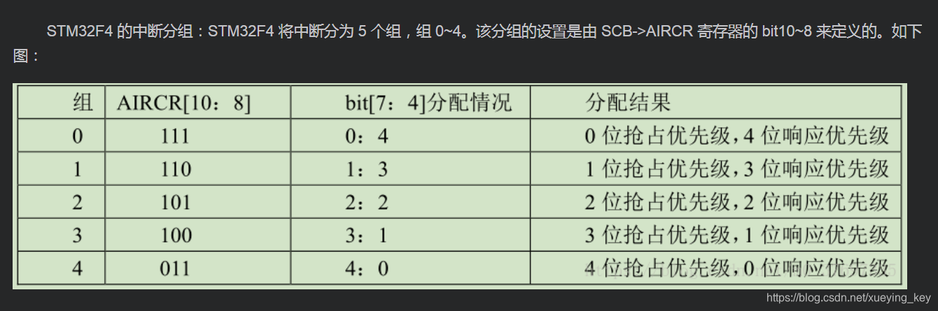 中断优先级分组:抢占式优先级和响应式优先级,每个中断源都需要被指定这两种优先级,另外注意中断嵌套;