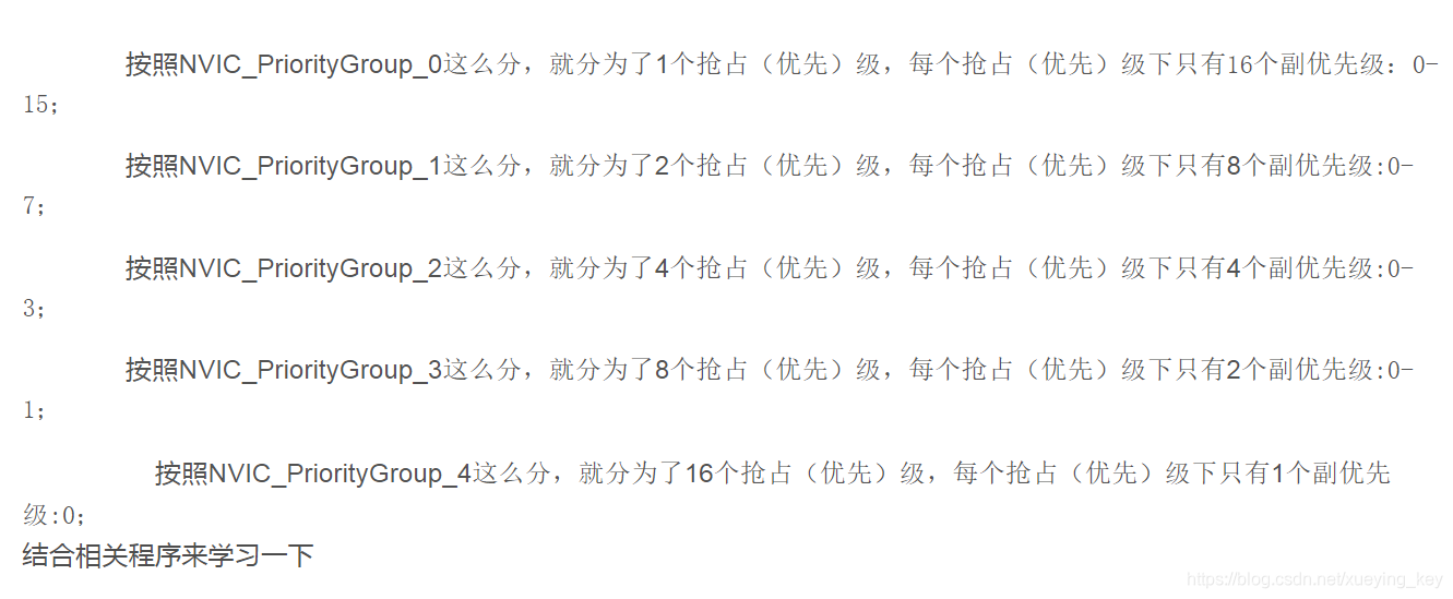 1) NVIC_PRIORITYGROUP_0: 0 位抢占式优先级, 4 位响应优先级;
