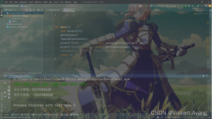 要求在main中从屏幕读入32个二进制数即0或者是1,调用intToValue函数返回此二进制数代表的有符号数的真值。