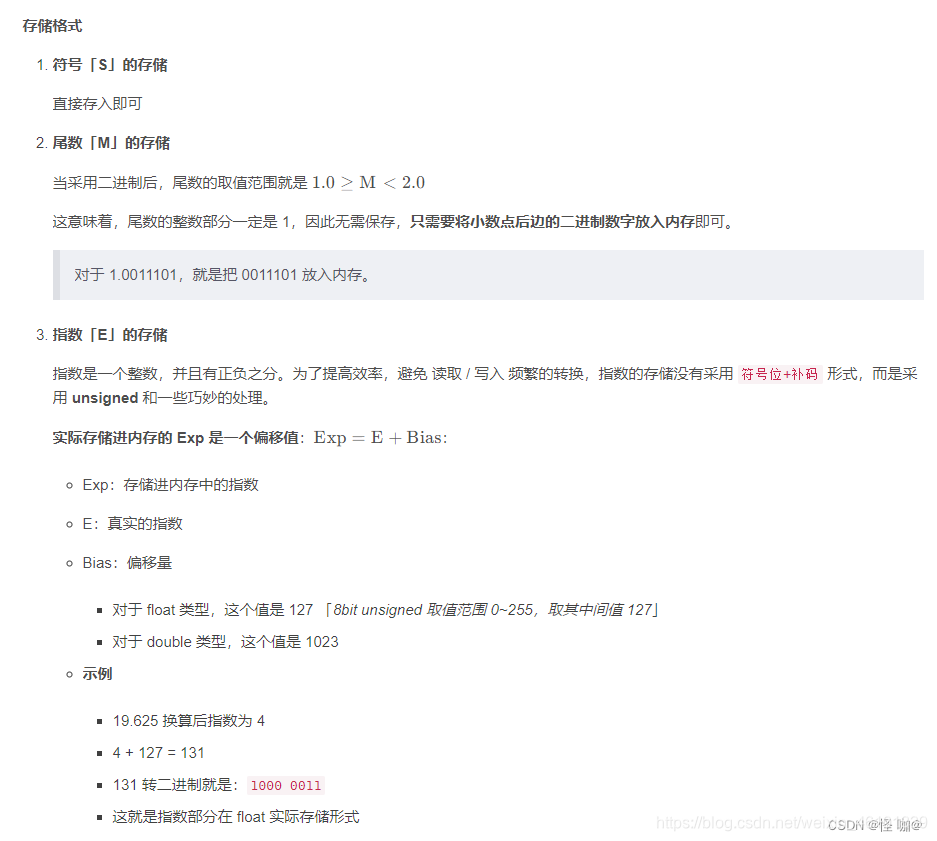 - 阶码(Exponent):用于表示指数部分,通常采用偏移表示法,其中指数值减去一个偏移值来表示实际指数。这允许表示非常大和非常小的数。