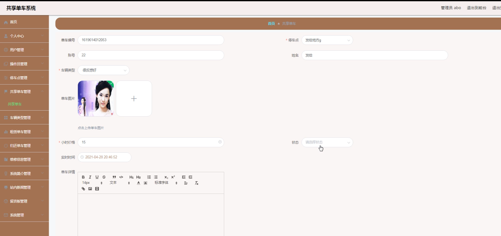 本文主要是采用springboot框架技术、mysql数据库、Tomcat服务器作为开发平台,系统采用B/S结构进行开发,完成一个校园自行车租赁系统。目标是实现一个以租赁为中心的校园自行车租赁系统,构建用户信息与账号,账号与订单信息有机结合的业务系统。提供了包括传统业务中最基本的用户注册、登录、查询、租赁、租赁记录管理、车辆信息管理、用户信息管理及订单信息管理等功能,是一个比较完善的系统。