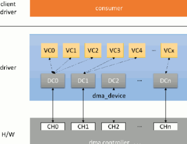 linux DMA engine 框架提供了 DMA controller和DMA client 两个框架。分别对应 DMA 提供者和 DMA使用者两个角度。pl330 是个 DMA 控制器,实际上就是站DMA提供者的角度。使用DMA的对象实际可以具体到内存到内存,内存就是DMA的使用者。DMA 控制器相关的操作都可以抽出来,他们对于其他使用者来说是想通的,这也是 linux 系统一贯的设计思路。DMA controller 框架抽象出 channel 对应 DMAC 的物理通道,又定义了虚拟的 channel,软件上可以实现多个虚拟 channel 对应一个物理通道。
