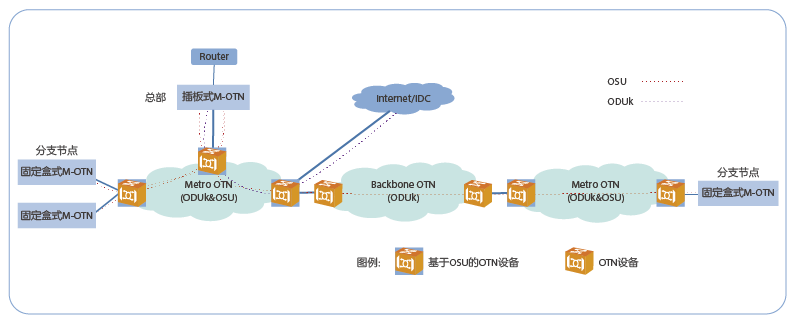 基于OSU的OTN设备是传统OTN设备的优化和扩展,通过引入OSU技术,可提供低成本、低时延、低功耗的以城域应用为主的综合业务承载方案。基于OSU的OTN设备在网络中的部署如图1所示。