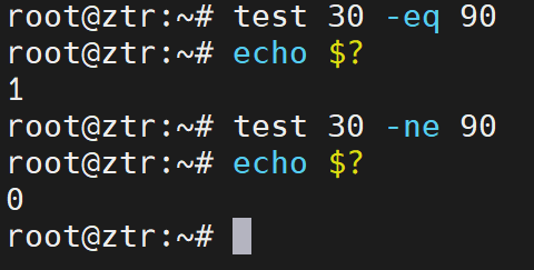 例如,利用整数判断操作符对整数进行比较。通过test命令判断两个整数30和90是否相等,结果为假,返回1.再判断30和90是否不等,结果为真,返回值为0.