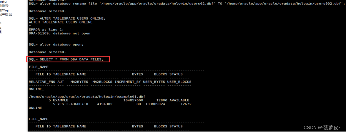 SQL> alter database rename file ‘/home/oracle/app/oracle/oradata/helowin/users02.dbf’ TO ‘/home/oracle/app/oracle/oradata/helowin/users002.dbf’;