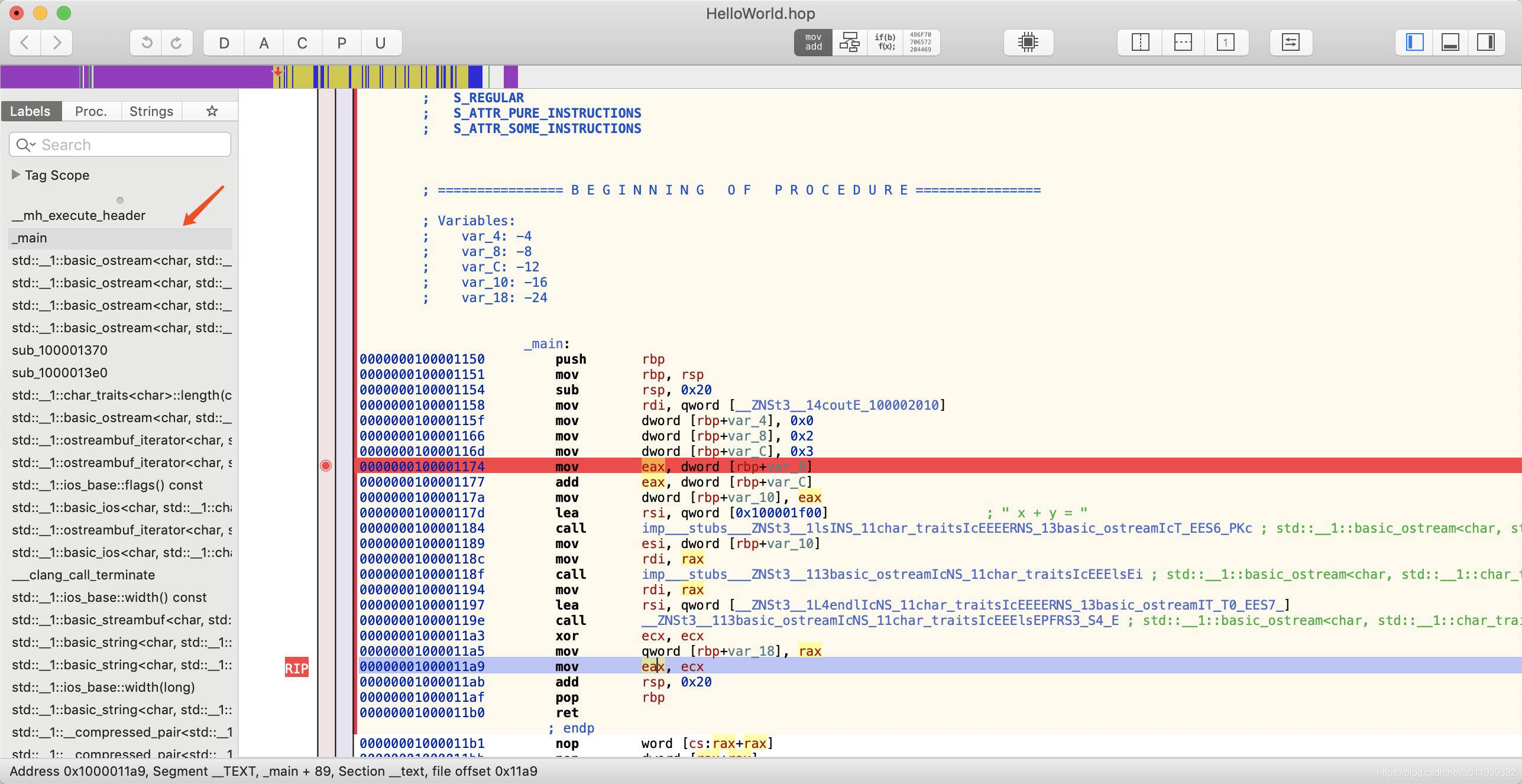 hopper disassembler 调试 HelloWorld