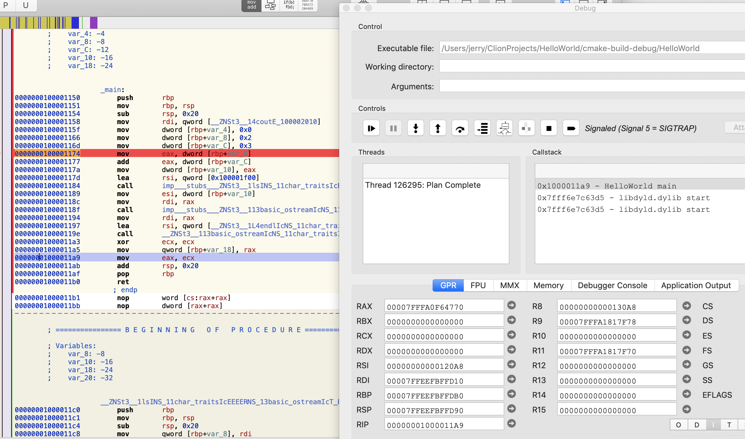图中 0000000100001174 的位置, 我添加了一个断点, 然后执行到 断点处, 我调试到了 图中 RIP 的指令的位置