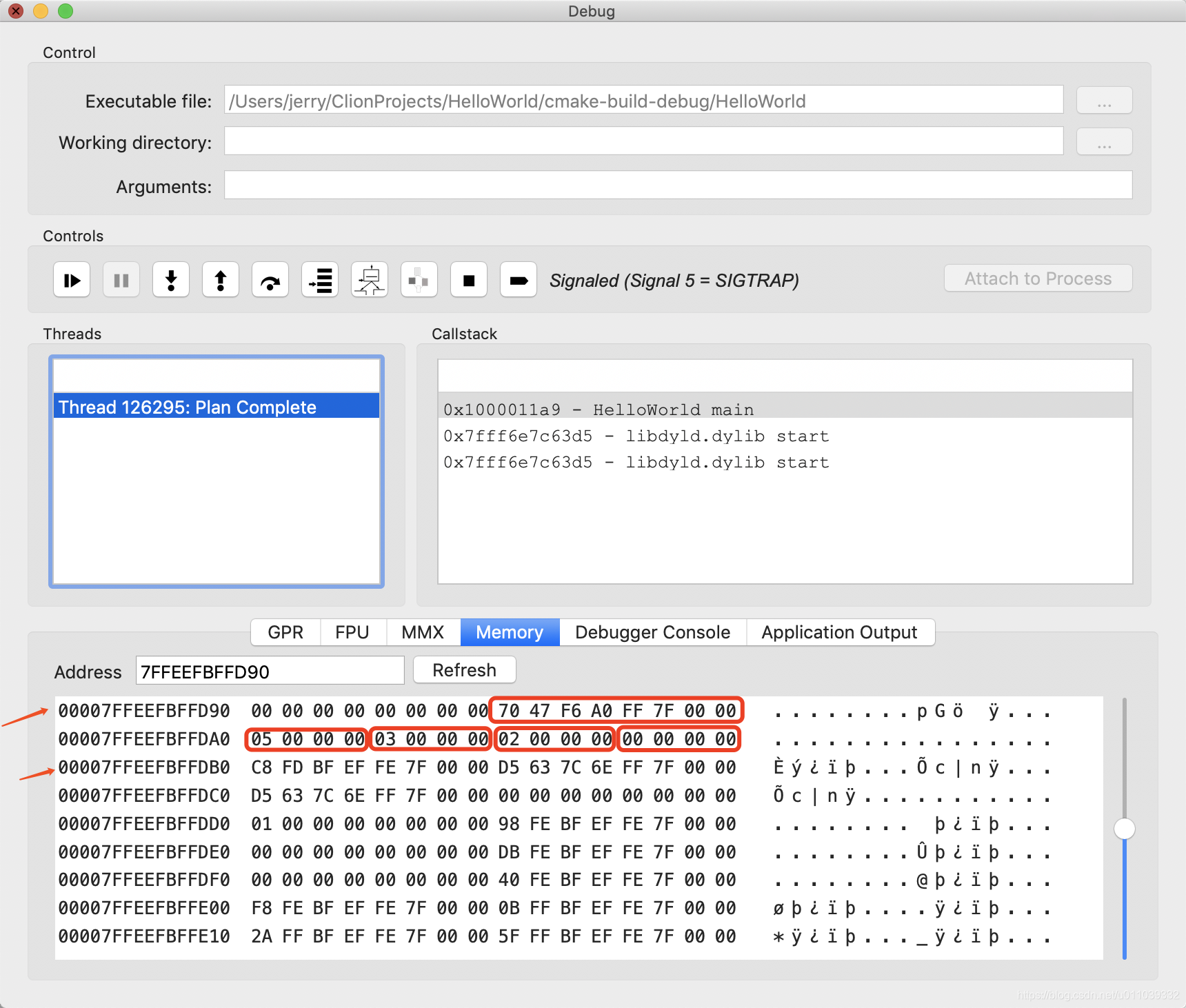 0x7FFEEFBFFDA0 行 从右到左 依次为 : 这个slot不清楚, x, y, z