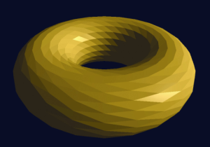 输出的环面中有很明显的伪影。其镜面高光有着块状、面片感。这种伪影在物体移动时会更加明显(但我们在书中没法展示移动的物体)。Gouraud 着色容易受到其他伪影影响。如果镜面高光整个范围都在模型中的一个三角形内——高光范围内一个模型顶点也没有,那么它可能不会被渲染出来。