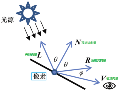 - 对象材质的环境光反射、漫反射和镜面反射特征;