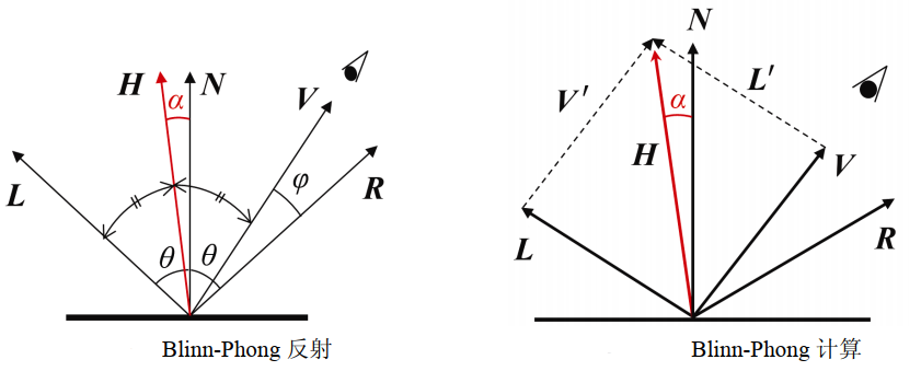向量 R 在计算过程中并不是必需的——R 只是用来计算角 φ 的手段。角 φ 的计算可以不使用向量 R,而通过 L 与 V 的角平分线向量 H 得到。H 和 N 之间的角 α 刚好等于 1/2(φ)。 虽然 α 与 φ 不同, 但 Blinn 展示了使用 α 代替 φ 就已经可以获得足够好的结果。角平分线向量可以简单地使用 L+V 得到。