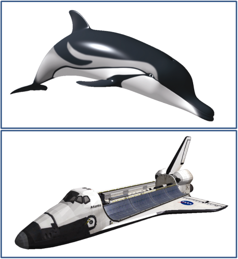 以下两幅图展示了拥有 UV 映射纹理图像的Studio552海豚,以及NASA航天飞机模型。这两个有纹理的模型都使用了增强后的 Blinn-Phong 光照,没有使用材质,并在镜面高光中仅使用光照进行计算。