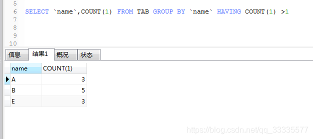 SELECT `name`,COUNT(1) FROM TAB GROUP BY `name` HAVING COUNT(1) >1