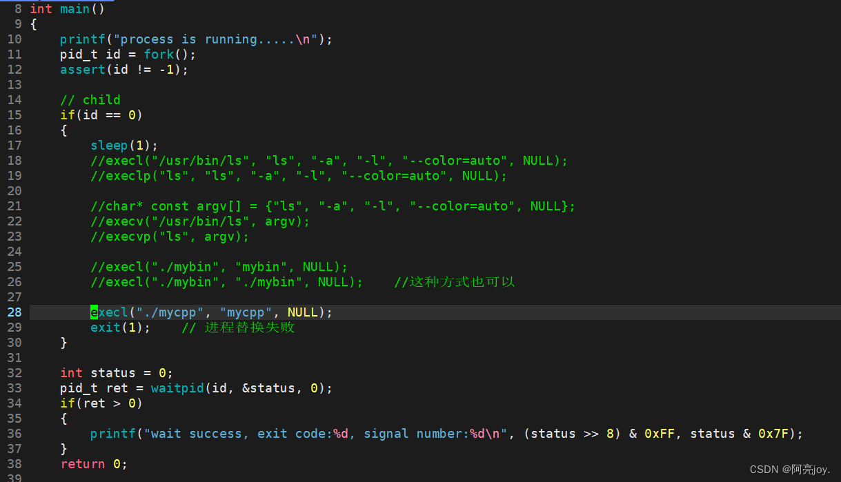 - exec 函数如果调用成功则加载新的程序从启动代码开始执行,不再返回;如果调用出错则返回 -1。