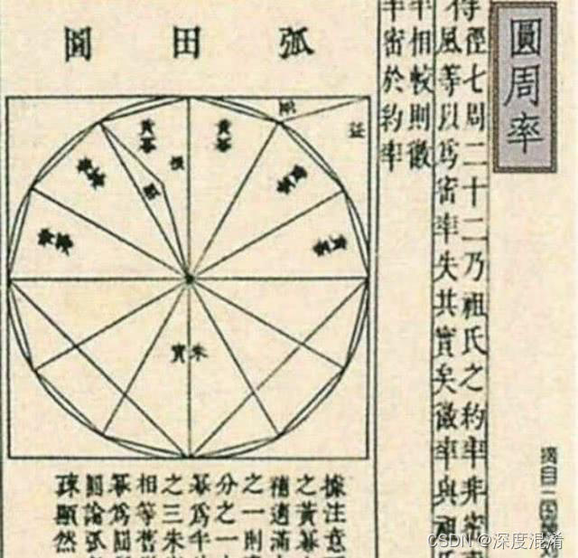 公元263年,中国数学家刘徽用“割圆术”计算圆周率,他先从圆内接正六边形,逐次分割一直算到圆内接正192边形。他说:“割之弥细,所失弥少,割之又割,以至于不可割,则与圆周合体而无所失矣。”这包含了求极限的思想。刘徽给出π=3.141024的圆周率近似值,刘徽在得圆周率=3.14之后,将这个数值和晋武库中汉王莽时代制造的铜制体积度量衡标准嘉量斛的直径和容积检验,发现3.14这个数值还是偏小。于是继续割圆到1536边形,求出3072边形的面积,得到令自己满意的圆周率。