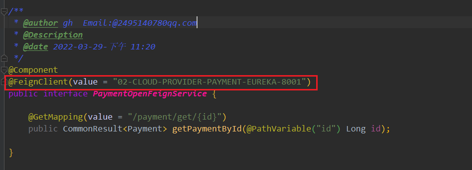 @FeignClient(value = "02-CLOUD-PROVIDER-PAYMENT-EUREKA-8001")