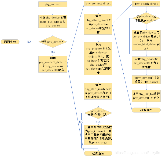 该接口主要用来进行一个net_device类型的变量与phy_device类型的变量的关联、设置phy_device的状态为PHY_READY,并启动phy_device的状态机,详细处理流程如下图所示