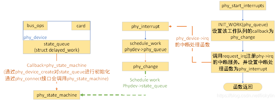 如下即为执行完phy_connect操作后,针对支持phy_device中断处理接口(phy_interrupt)以及其底半部处理接口(phy_change)与phy_state_machine之间的关联。